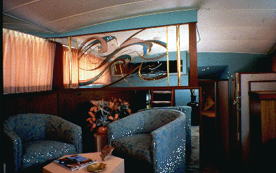 Nancy Gong Gong Glass Works PO Box 10344 165 Linden Avenue Rochester, NY 14610 ( 716 ) 586 - 1993 Fax: (716) 383-0916 "White Water," 1988. 54"x 30". Leaded glass in a brass frame aboard the Beverly Ann, a 46' Bertram yacht/cabin cruiser currently berthed in Massachusetts. Interior Design: Studio One Interiors. Photo Chris Maggio. This artwork traveled well through the rough waters of the intercoastal waterway at the tip of Hurricane Hugo's path. It casts lively, colorful shadows as daylight ripples the water and is refracted through the glass. |
