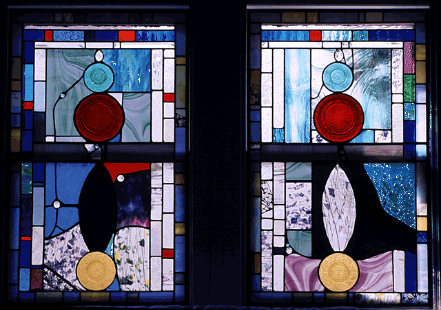 Kim Clark Renteria Lighthouse Glass 2409 Huldy Street Houston, TX 77019 USA ( 713 ) 524 - 5945 Focal point of guest bedroom suite, Johnnie Denton Residence, Houston, TX, 1995. 44.5" h. x 27" w. Photograph: W.A. McAlpine. Second-story, large, contemporary space with unusual architectural detail. The western exposure with its intense afternoon light has a view 90 percent obstructed by the white side walls of a neighboring home. This pair of windows illustrates the impact of light on project design. Originally, the client desired a design incorporating a great deal of transparent and clear, textured glass for this remodeled space. However, once remodeling was complete, the need to block the heat and intensity of the summer sun became apparent. To alleviate this problem, the design was modified to incorporate the rich jewel tones and vivid colors favored by the client. |