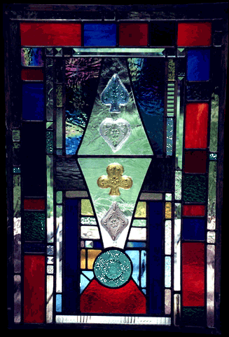 Kim Clark Renteria Lighthouse Glass 2409 Huldy Street Houston, TX 77019 USA ( 713 ) 524 - 5945 Guest bathroom window, 1993. 36" h. x 24" w. Dr. Barry Thorp/Ms. Nancy Stone Residence. Photograph: W.A. McAlpine This window provides a playful, decorative counterpoint to its formal entry hall companion piece, while retaining the same color palette. Depression glass depictions of bridge suits reflect clients' favored leisure-time activity and provide three-dimensional effect. Fragmented design creates privacy from the street. |