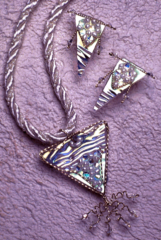 Jayne Persico J.P. Glassworks 50 North Vine Street Hazleton, PA 18201 USA ( 717 ) 454 - 3789 Email: flea@mail.prolog.net Fire and Ice series, 1995. Fused dichroic glass pendant and earrings with floating pearls and crystals framed with gold wire. Suspended on silk and pearl cording. Photograph: Glenwood Jackson. |