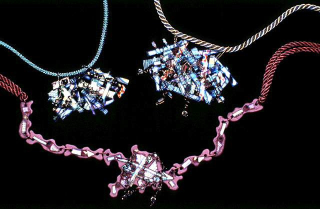 Jayne Persico J.P. Glassworks 50 North Vine Street Hazleton, PA 18201 USA ( 717 ) 454 - 3789 Email: flea@mail.prolog.net Fire and Ice series, 1995. Three fused pendants with floating crystals and beads and gold wire suspended on silk cord. Photograph: Glenwood Jackson. |
