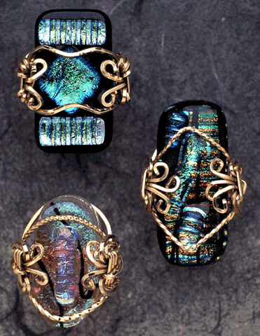 Jayne Persico J.P. Glassworks 50 North Vine Street Hazleton, PA 18201 USA ( 717 ) 454 - 3789 Email: flea@mail.prolog.net Futuristic Gem series, 1995. Fused dichroic glass rings on gold wires. Photograph: Glenwood Jackson. |