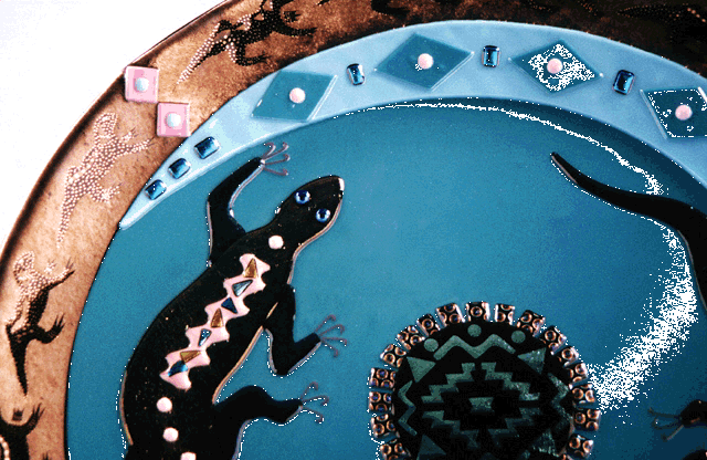 Avery Anderson Anderson Glass Works HC33 - Box 61N Arrowsic, ME 04530 9400 USA ( 207 ) 443 - 4157 Fax: (207) 443-4331 Email: glassart@ime.net Web site: http://www.igga.org/averya Member, IGGA Lizard Bowl (detail), Animal Medicine Series #1, 1995. 17.75" dia. Fused, etched, slumped glass. |
