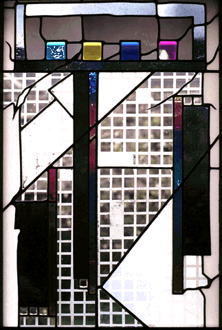 Leone McNeil Lead & Light Works PO Box 552 Mendocino, CA 95460 USA ( 707 ) 937 - 5227 Fax: (707) 937-5227 Window/screen, 1994. 24"x 30". Collection of the artist. Photographer: Mark Safron. Sandblasted dichroic glass. Prototype for a section of window for Life Center Building, San Francisco, California. |